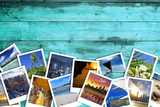 Background with many photos from vacation from different parts of the world with effect of splashes on white background. Design, advertising, concept