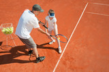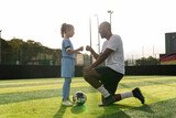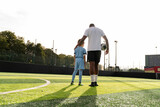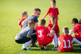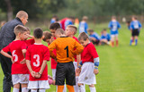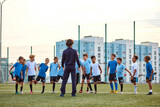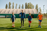 confident football trainer man teach, instruct kids boys in stadium. young caucasian boys attentively listen to him, want to win