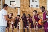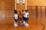 Schoolkids and basketball coach forming hand stack at basketball court in school