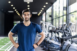 Portrait of young handsome Caucasian man with beard in blue color sportswear standing and putting hands on waist in gym or fitness club. Behind him is exercise machines and equipment. Fitness concept.
