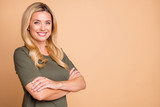 Photo of cheerful toothy beaming business people standing confidently with hands folded counted as reliable person of green intelligence isolated beige pastel color background
