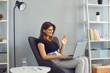 Woman waving hand has video call laptop computer online sitting in armchair at home.
