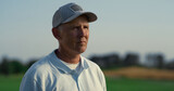 Professional golf player enjoy course country club. Golfing coach looking away.