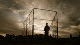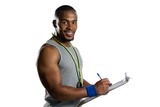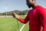 Black sportsman in a football field checking times with a stopwatch. Serious concentrated face
