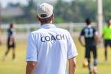 Back of male football coach wearing white COACH shirt at an outdoor sport field coaching his team during a game