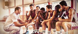 Portrait of happy biracial male coach over female basketball players playing basketball at gym