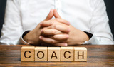 The inscription Coach and a man sitting with his hands clasped in a lock. Trainer and mentor. Self improvement. Achieving goals through training and guidance. Skills development