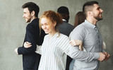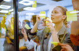 Group of young modern people working on project together. Business colleagues writing on sticky note on glass wall with coworkers standing by in office. Startup Business. Planning, analysis.