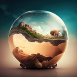 Surrealist illustration of miniature landscape in fishbowl (Generative AI)