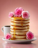 Stack of pancakes with honey drizzle and pink roses for a breakfast themed scene