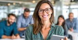 Confident businesswoman in an office holding a tablet with colleagues in the background