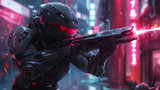 Futuristic cybernetically enhanced mercenary in action in a neon-lit cityscape