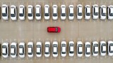 Aerial view of a parking lot with white cars and a single red car in the center