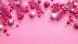 Pink Christmas Background With Baubles Berries Stars And Fir Branches For Festive Holiday Season And Winter
