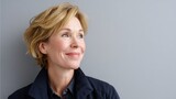 Portrait of a charismatic senior woman in her 60s with short white hair, wearing a navy blazer, exemplifying grace and confidence in an elegant studio setting.
