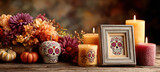 Colorful day of the dead altar with sugar skulls and holiday candles