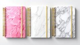 Modern spiral notebooks with marble and pastel pink covers on white background