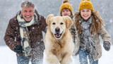 Happy family running with golden retriever through snowy forest
