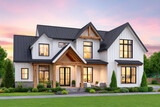 Modern Farmhouse Exterior With White Siding; Black Roof; Wooden Accents; Landscaping And People On Porch At Sunset For Real Estate
