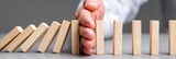 Hand Stopping Wooden Dominoes From Falling On Gray Surface For Business Risk Management And Prevention Concepts