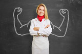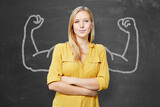 Zufriedene Studentin steht vor Tafel mit Muskel Armen als Konzept