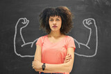 Studentin oder Unternehmerin vor Tafel mit Muskel Armen