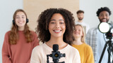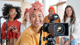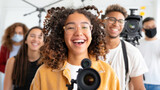 Diverse group of young filmmakers smiling behind cameras in a studio setting