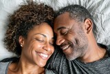 Happy African American Couple Lying Head To Head On With Eyes Closed Smiling In Bedroom At Home Showing Love And Affection
