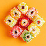 Blonde Frau hält viele bunte Tabletten vor ihrem Mund