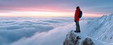 Hiker On Snowy Mountain Peak Above Clouds At Sunset Adventure And Travel Concept Panoramic Landscape