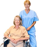 Smiling caregiver with elderly woman in wheelchair inside rehabilitation facility