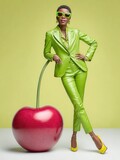 Stylish green suit woman with oversized sunglasses posing beside giant cherry prop in a vibrant editorial setting