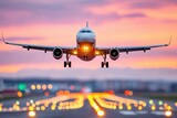 Commercial airplane landing on a runway during a vibrant sunset