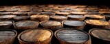 Close-up of wooden whiskey barrels arranged in a dark aging cellar