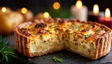 Delicious potato and cheese quiche with a decorative festive ambiance