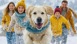 Happy family and golden retriever enjoying a snowy day outdoors.