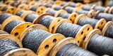 Rows Of Wooden Spools With Black Cable For Industrial Applications And Manufacturing Processes Showing Organization