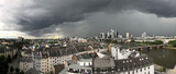 Panoramic view of cityscape under dramatic storm clouds and skyline