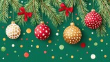 Festive Christmas Ornaments With Pine Branches And Confetti On Green Background For Holiday Season And Celebrations