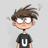 Cartoon Boy With Question Marks Above Head On Gray Background Illustration Of A Confused Child With Brown Hair And Black Shirt Uncertainty