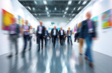 Blurred Motion Of People Walking Through Art Fair Exhibition Hall With Modern Paintings And Bright Lighting Artworks On Display