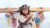 Jesus carrying the cross with followers in a vivid artistic depiction