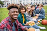 Group of friends enjoying food together on a university campus lawn outdoors
