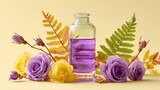 Purple liquid in a glass bottle surrounded by colorful flowers and ferns
