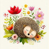 Adorable hedgehog sleeping peacefully with colorful flowers in a sunny garden