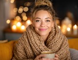 Elegant woman enjoying a hot beverage in a warm and cozy home