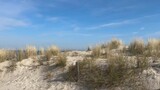 Sandy beach path through dunes to Baltic Sea on sunny spring day.