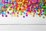 Colorful Confetti Circles Scattered On White Wooden Background For Celebrations Parties And Festive Events Decoration Creating A Cheerful Atmosphere