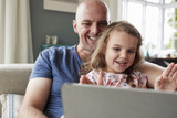 Father and daughter using tablet computer at home, close up