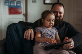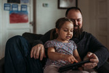Close up of dad and young daughter playing on tablet during isolation